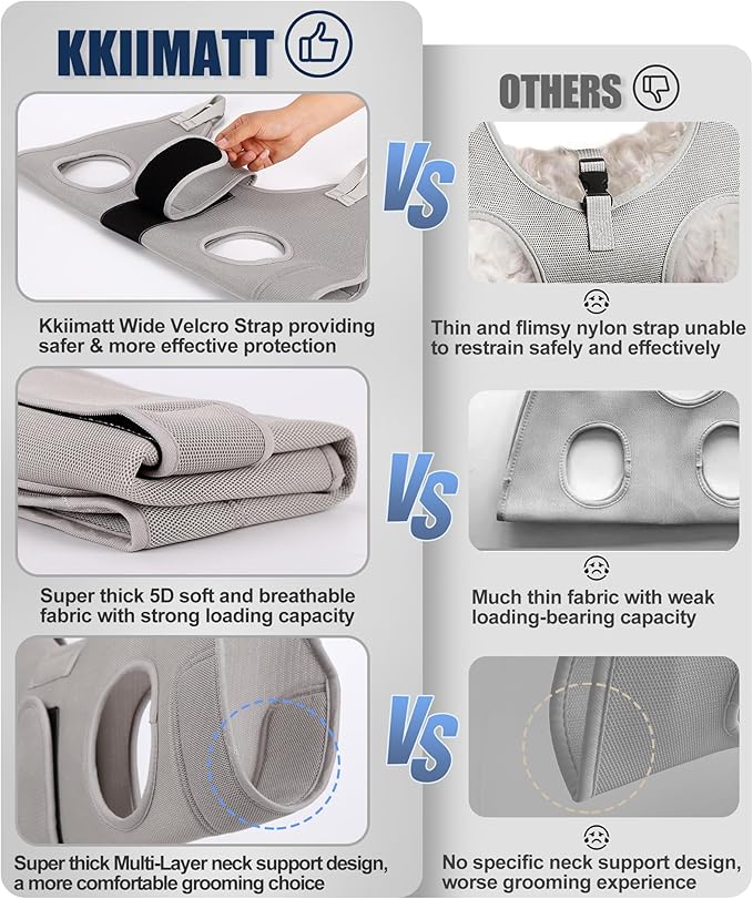 - Kkiimatt Upgraded Wide Strap Dog Hanger for Nail Trimming: Compared with Kkiimatt's previous version, the Kkiimatt 2024 Grey Edition Dog Hammock for Nail Trim has wide strap restraints, which can effectively prevent dogs from escaping compared to other grooming hammocks that have no restraint straps or thin clip-on restraint buckle.