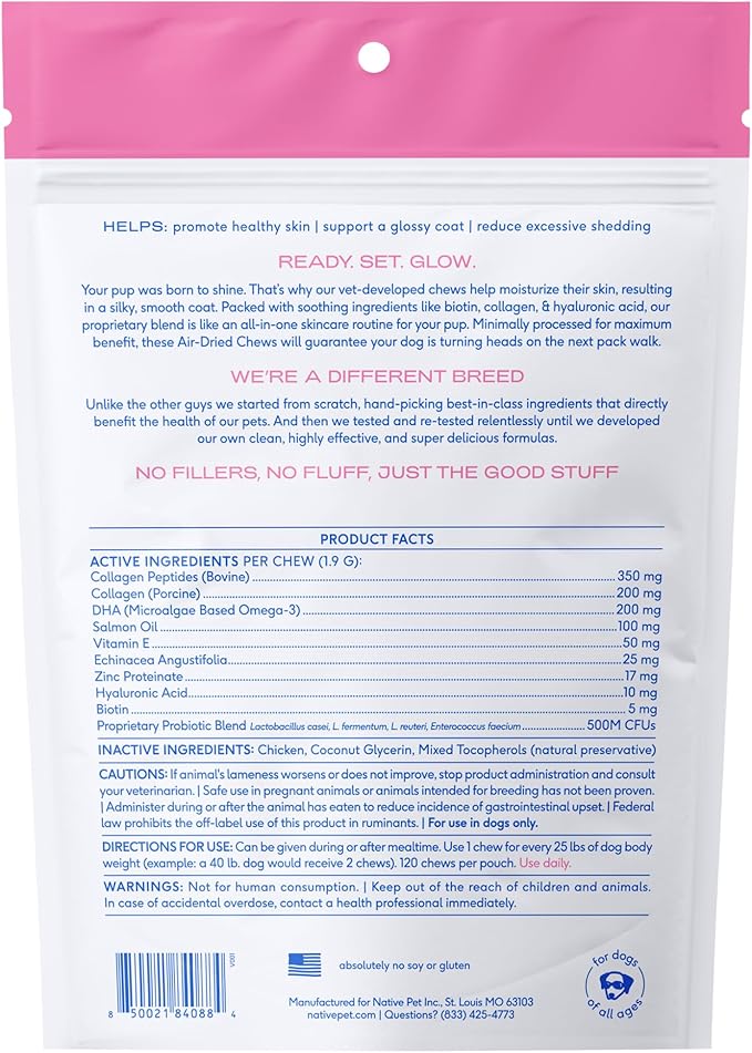 Native Pet Omega Skin and Coat Chews for Dogs - Dog Skin and Coat Supplement for Healthy, Shiny Fur, Reduce Shedding and Dry Spots - Made with Omega 3 Fish Oil and Wild-Caught Salmon Oil - 120 Chews