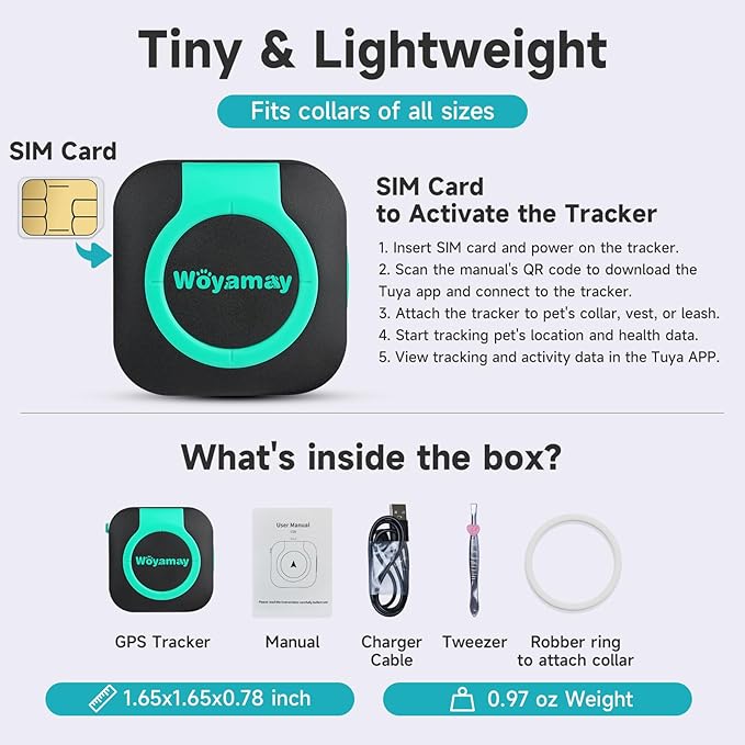 - Activate with 4G SIM & Free App: Activate the Woyamay GPS tracker with a 4G data SIM card from major U.S. carriers (not included in the package). Ensure at least 0.03GB/month of active data. The Woyamay cat and dog GPS tracker offers access through the free and user-friendly Tuya APP, available on both iOS and Android, making it a truly cost-effective solution for your pet's safety