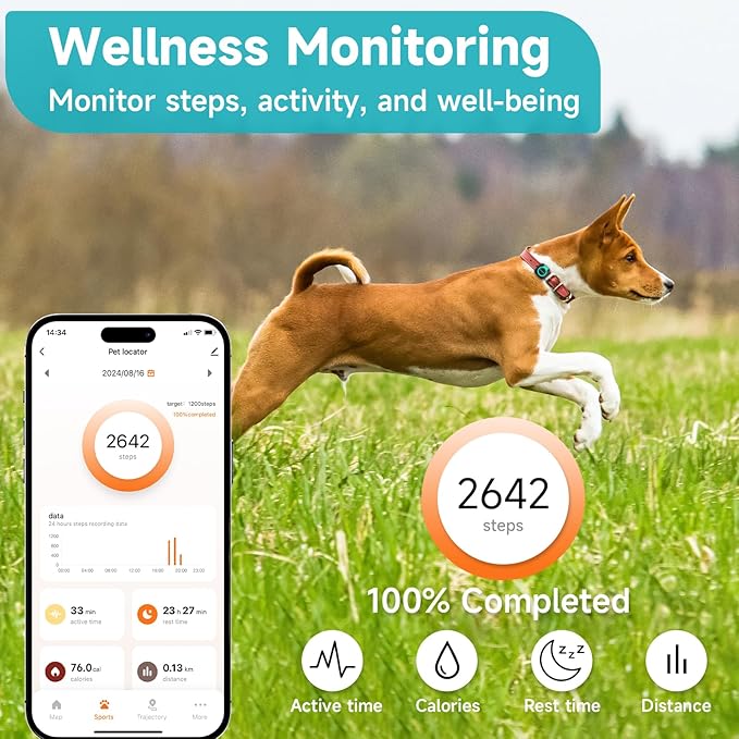 - Comprehensive Health and Activity Insights: Stay on top of your pet's health with advanced monitoring features. Track daily steps, activity levels, calories burned, sleep patterns, and more. The Woyamay dog and cat GPS tracker also records your pet's activity history, allowing you to check and optimize their exercise routines, ensuring a happier, healthier pet