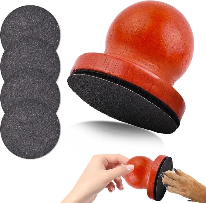 - 【QUALITY MATERIAL】 Our dog nail file is made of high quality logs with abrasive pads, which won't freeze your hands in winter use compared to other materials. The wooden handle has smooth edges and feels comfortable in your hand. The size is 2.36*2.36 inches, the size of the base is also 2.36*2.36 inches