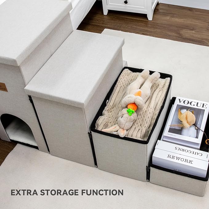 - 2-IN-1 DOG STAIRS WITH STORAGE: Zerbuger pet stairs not only provide a stable and cozy stair for your pet to climb, but also serve as a convenient large storage area total of 190QT for your pet's clothes, toys, or any other supplies. Our pet steps are covered with removable lids, Every steps are designed as storage boxes.