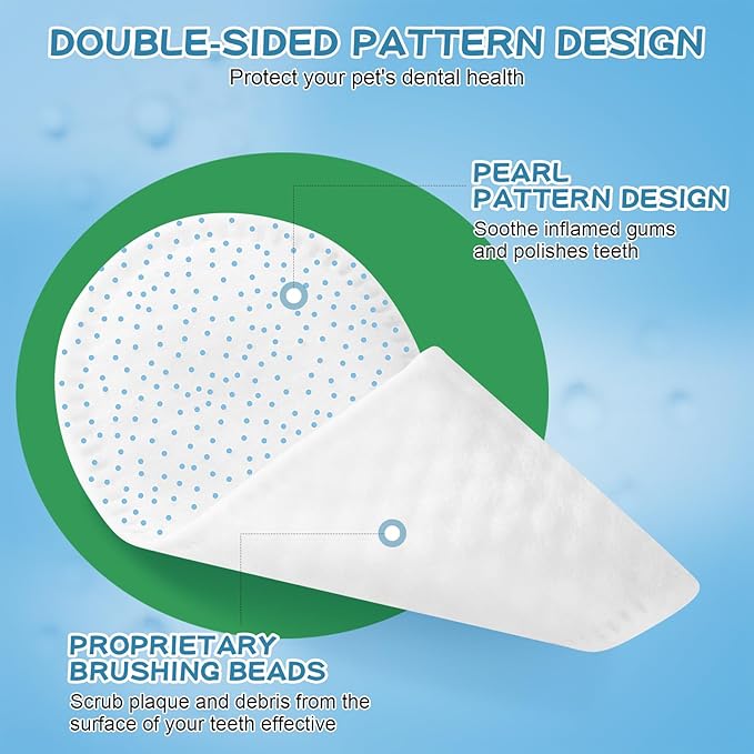 - Dual-Action Plaque And Tartar Remove:Our pet dental finger wipes are designed with double-sided.On one side is pearl pattern design that can soothe inflamed gums and polishes teeth.Another side is proprietary brushing beads that scrub plaque and debris from the surface of your teeth effective.