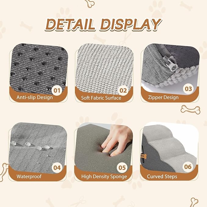 - STABLE AND NON-SLIP: Surface layer of the dog ladder is made of thick coral fleece, providing a soft and soft experience for your pet's feet. Back of the coral fleece is a waterproof layer, so you won't worry about the dog peeing. Side of the dog stairs for high beds is made of abrasion-resistant linen so that pets can grind it's paws