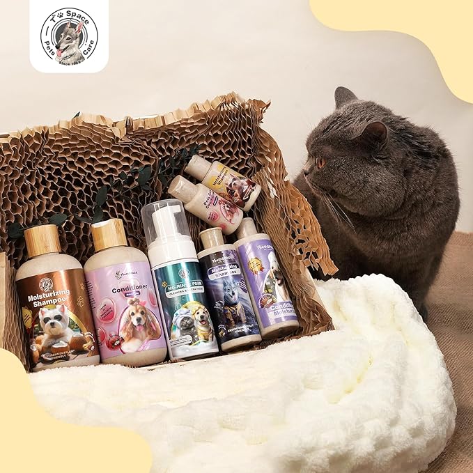 - Multi-functional dog bathing supplies set, deep cleaning dog stains, special moisturizing formulas can moisturize the dog's dry skin and hair, so that the hair shiny smooth and fluffy, to prevent hair knots, can also be used for shedding dog