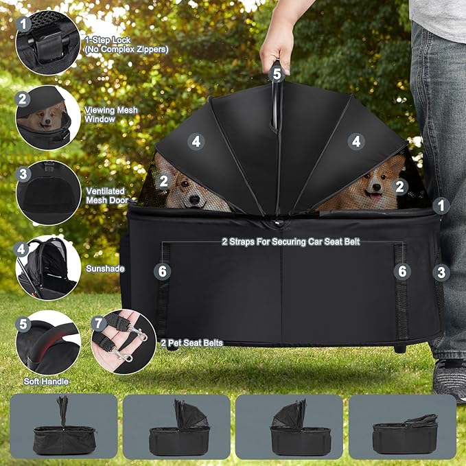 - 3-IN-1 Dog Stroller: Our dog stroller is more than just a pet stroller. The detachable carrier converts it into a pet carrier and also functions as a secure pet car seat with built-in seat belt straps. And at home, it doubles as a cozy pet house!