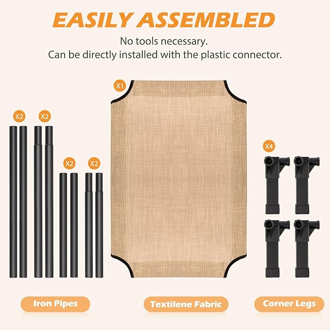 - Easy to Install: The cooling dog cot can be installed without the use of any tools, screws and can be installed directly with the plastic connector. It only takes a few minutes of your time, and presto! It's up and ready for your pet to enjoy in.