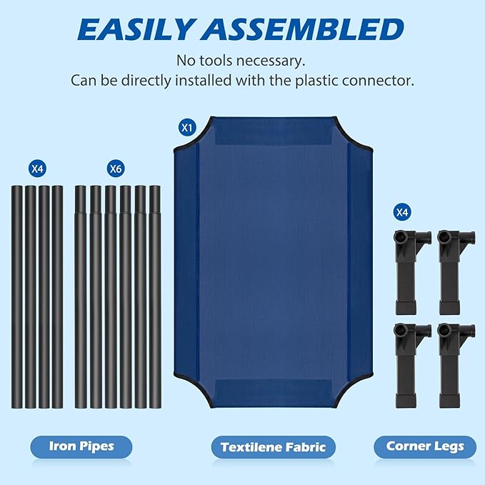 - Easy to Install: The cooling dog cot can be installed without the use of any tools, screws and can be installed directly with the plastic connector. It only takes a few minutes of your time, and presto! It's up and ready for your pet to enjoy in.
