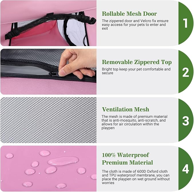 - Waterproof Foldable Pet Playpen: The pop up playpen is waterproof, light weight and folds up, it can be put into a bag for convenient carry and storage. Perfect for travel, camping, picnic, or at the beach