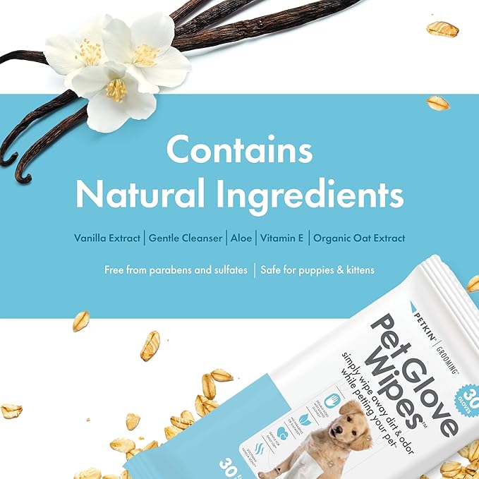 - Natural Cleansing Formula - Each glove is moistened with a cleansing formula that is free from sulfates and parabens. Contains Vanilla Extract, Aloe Vera, Vitamin E and Organic Oat Extract to naturally clean and condition your pet's coat and body.