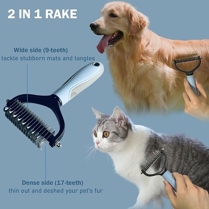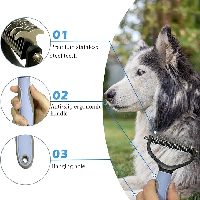 - 【Dog Brush for Shedding】With a dual-sided design, use the wide sided to tackle stubborn mats and tangles, and the dense side to thin out and deshed your pet's fur. Undercoat rake for dogs are designed with an ergonomic handle, and the lightweight, comfortable, non-slip rubber handle prevents the dog brush from moving around as you groom your pet.