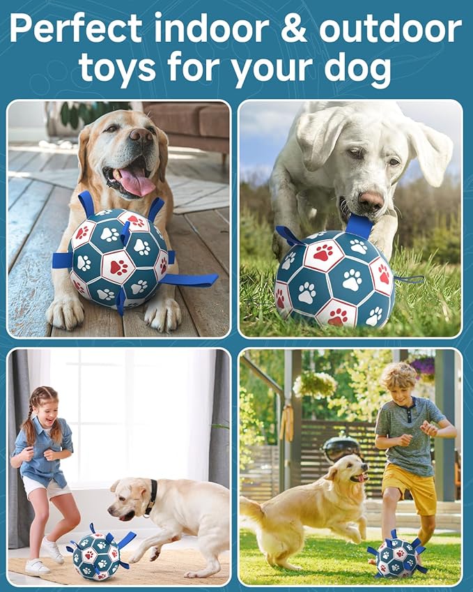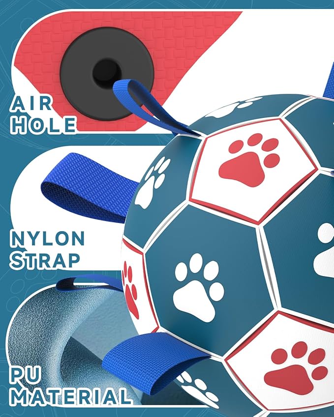 • Interactive Dog Toy: Dog soccer ball with nylon tabs sewn evenly into the seams not only create an erratic bounce that dogs love to chase, but also make it easier for the dogs to fetch, toss, tug and retrieve. Dog paws are printed evenly on the dog toy ball to attract dogs attention. There's a longer strap for people to hold onto the ball, making it a great interactive dog toy to train your dogs
