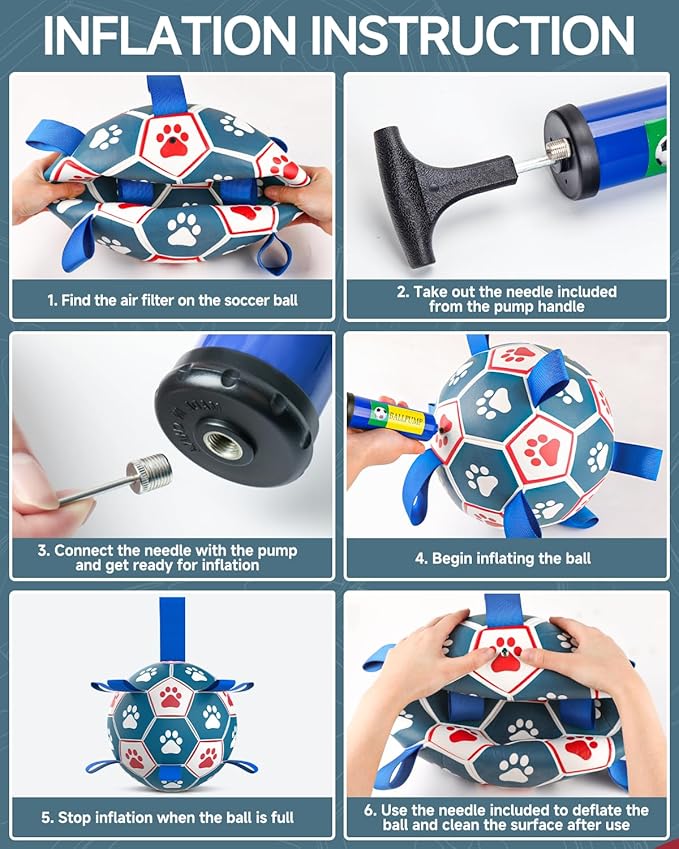 • PUMP and Needle Adapter Included: The herding balls for dogs comes deflated. There's a needle point adapter and a pump inside as well while other items in the same market only include a ball needle. The large soccer ball dog toy is 10 inches in diameter, perfect for giant and large breeds, not for aggressive chewers