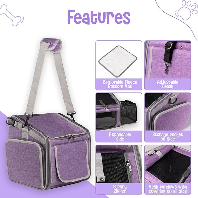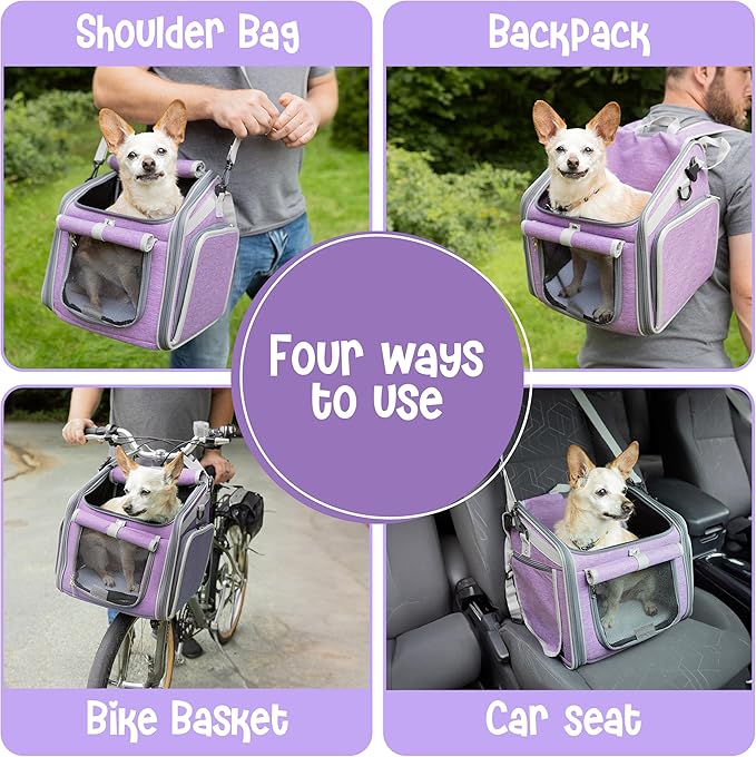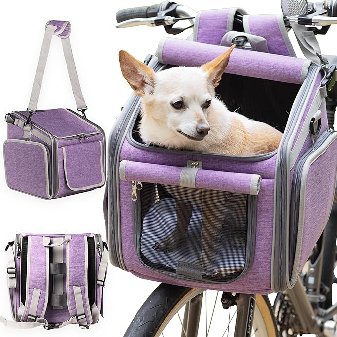 Dog Bike Basket, Mesh Windows, 2 Safety Leashes, Soft Sided, Safe Comfortable Pet Carrier for Small Dogs, Cats (Purple)