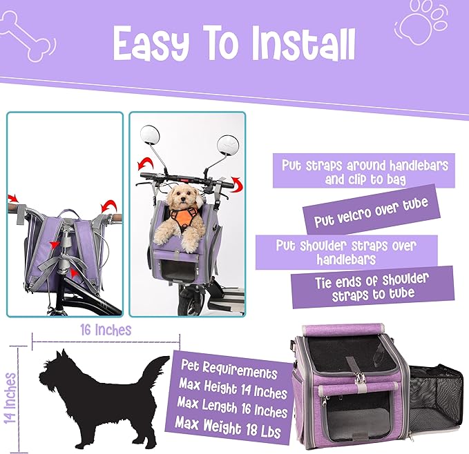 - [SAFE & COMFORTABLE] This bag was designed with your pets comfort and safety in mind. There are two leash options to help keep your pet safe. The handlebar straps are uniquely designed to prevent the bag from getting loose while riding. Larger top opening prevents your pets neck or body from being hurt while going over bumps. Large ventilated sides and padded interior ensure maximum comfort for your pet.