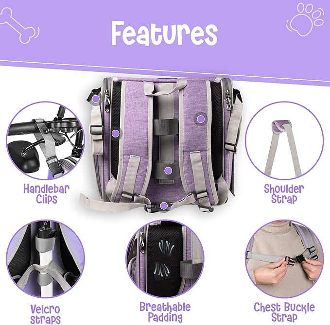 - [TAKE YOUR PET EVERYWHERE] This bag works great on the bicycle but has so many other uses. The backpack straps allow you to take it off the bike and carry your dog everywhere you go. This also comes with a shoulder strap so you have more ways to carry your furry friend and can even be used as a car seat.