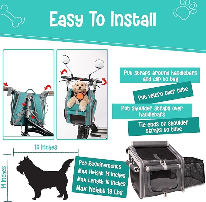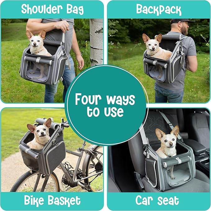 - [TAKE YOUR PET EVERYWHERE] This bag works great on the bicycle but has so many other uses. The backpack straps allow you to take it off the bike and carry your dog everywhere you go. This also comes with a shoulder strap so you have more ways to carry your furry friend and can even be used as a car seat.