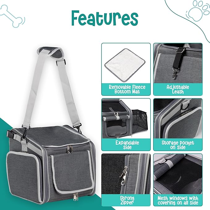 Dog Bike Basket, Mesh Windows, 2 Safety Leashes, Soft Sided, Safe Comfortable Pet Carrier for Small Dogs, Cats (Grey)