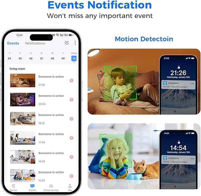 - Event Notification & Automatic Tracking: When the wireless home camera detects movement from a person or pet, it will automatically track the motion and send a real-time notification to your phone, keeping you informed and connected at all times.