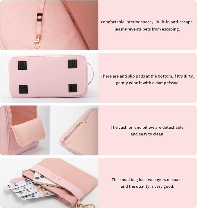 - 【Pillow Design】The dog purse carrier allows your dog/cat to stick his head out of the bag and rest it on the cushion, which is comfortable and soft to satisfy your pet's curiosity about the world. Meanwhile, the design makes it easier and more convenient for you to interact with your pet and enjoy a fun trip.