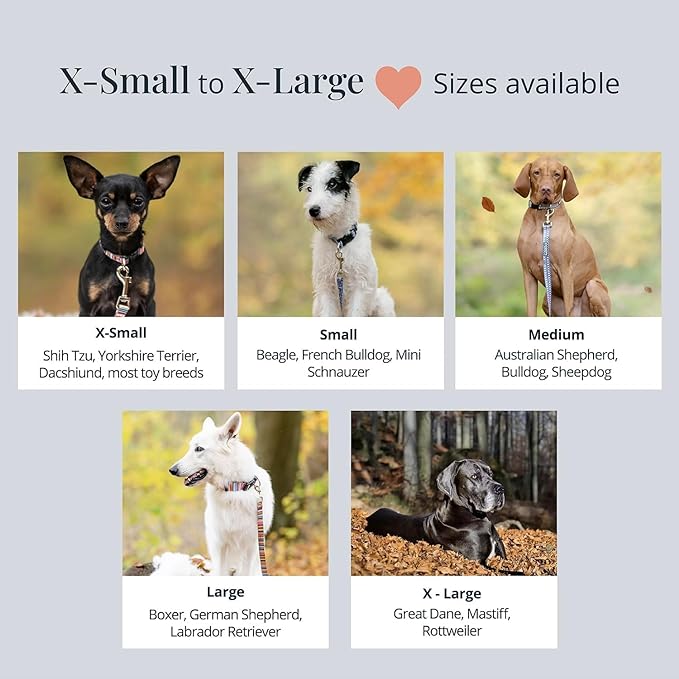 - 🤍CONVENIENT AND RELIABLE - EASY CLICK ON/OFF COLLAR BUCKLE GETS YOU AND YOUR DOG OUT THE DOOR QUICKLY! Our collars are durably constructed with an easy click, strong buckle, weatherproof D ring and HIGH DENSITY nylon. Our soft and flexible collars are dog approved – they are super comfortable, as well as long lasting. Washable by hand or on gentle cycle. Lucky Love Dog adjustable collars come in four or five sizes (depending on pattern). SEE SIZING BELOW "