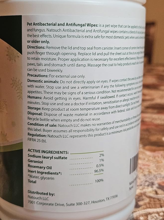 - NATURAL PET WIPES: The ingredients to have in wipes enriched with natural ingredients geraniol, glycerin, and rosemary oil. Geraniol has antifungal and antibacterial effect and Help improve oily and rough skin, balances and soothes dry oily itch skin. Rosemary oil is known for soothing, rejuvenating and nouishing the scalp and skin