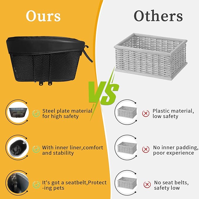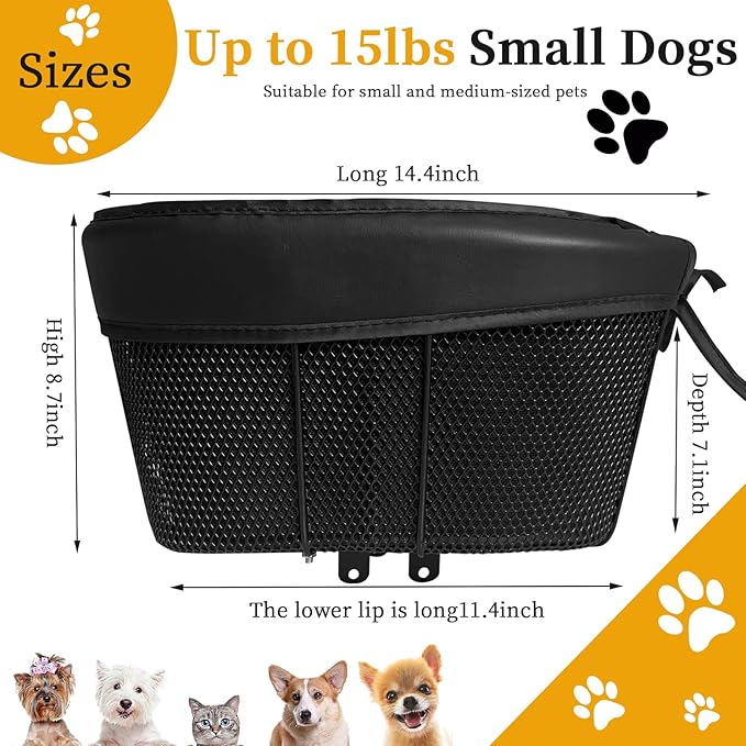 - Product size:This dog bike basket measures 14.4"L x8.3"W x 8.7"H, Support pets weighing up to 15 pounds, Our dog bike basket is perfect for small sized dog, cat, puppy, and pet.