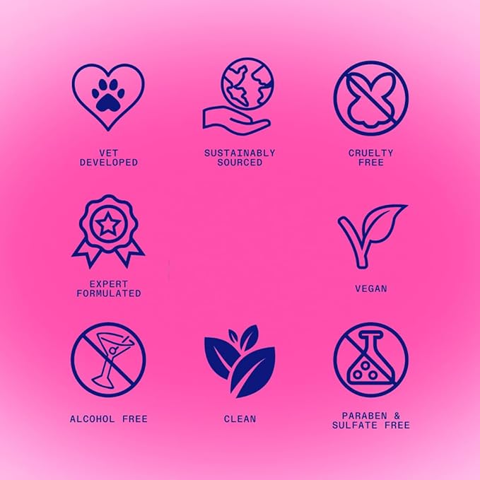 - Clean & sustainably sourced: Made with the safest ingredients. Non-toxic, vegan, cruelty-free, pH balanced for dogs, no harsh chemicals, alcohol-free, paraben & sulfate-free, sustainably-sourced and made with love in the USA.