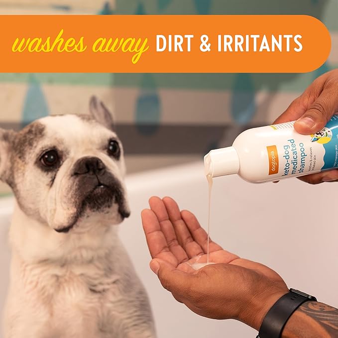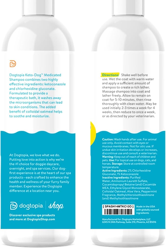 - Formulated to provide a therapeutic bath, Dogtopia’s Keto-Dog Medicated Shampoo washes away the microorganisms that can lead to skin conditions. The added benefit of colloidal oatmeal helps to soothe and moisturize.