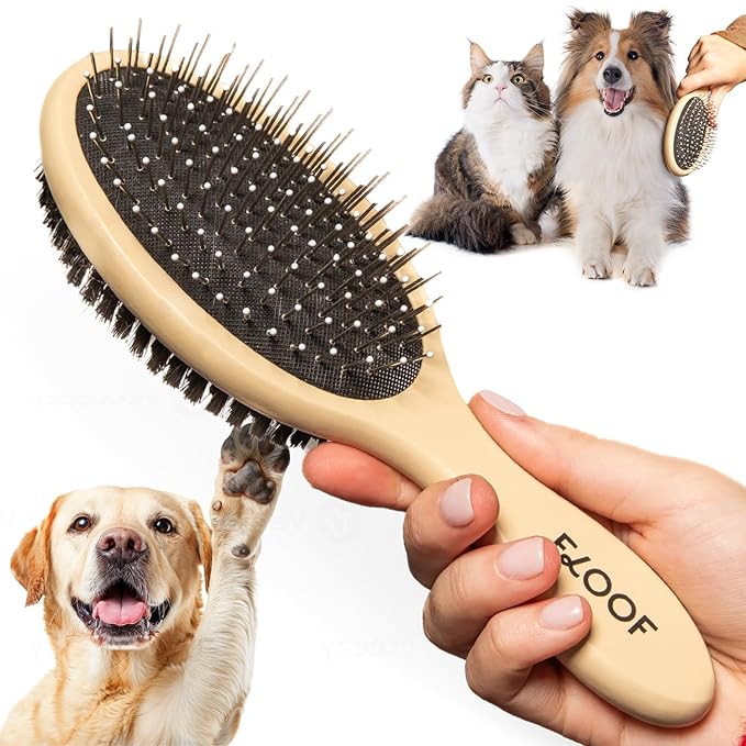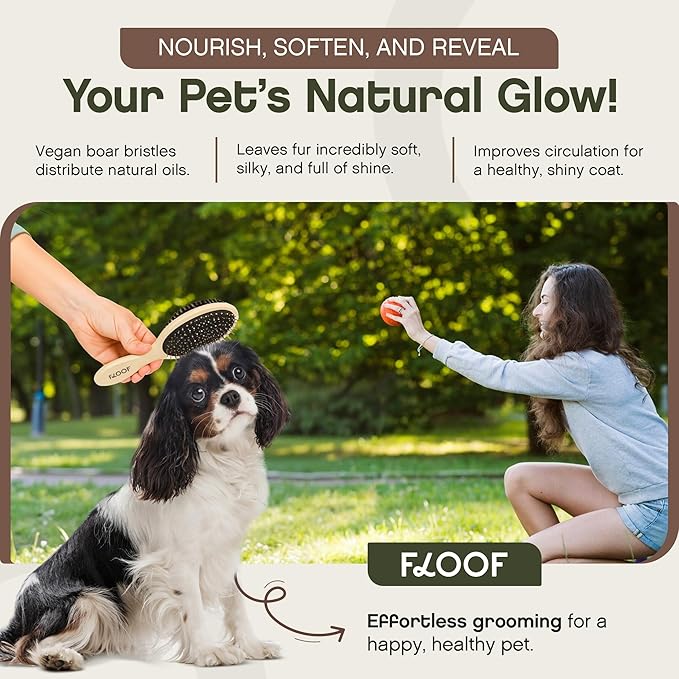 Floof Double-Sided Pet Brush,Metallic Pins & Vegan Boar Bristles for Long & Short Haired Dogs and Cats | Premium Wooden Handle for Comfort | Eco-Friendly Deshedding,Gentle Detangling,& Easy to Clean