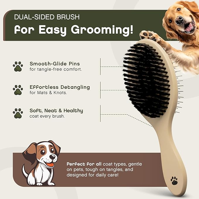 - Vegan Boar Bristles for a Shiny Coat: The vegan boar bristles on this brush are a sustainable, cruelty-free alternative to animal hair bristles. These soft yet effective bristles gently smooth and distribute natural oils throughout your pet’s coat, promoting a healthy, shiny appearance. Regular use of the bristles helps reduce dry, flaky skin and improves overall coat condition. The gentle bristles are ideal for pets with sensitive skin, ensuring their grooming experience is both soothing and effective without irritation.