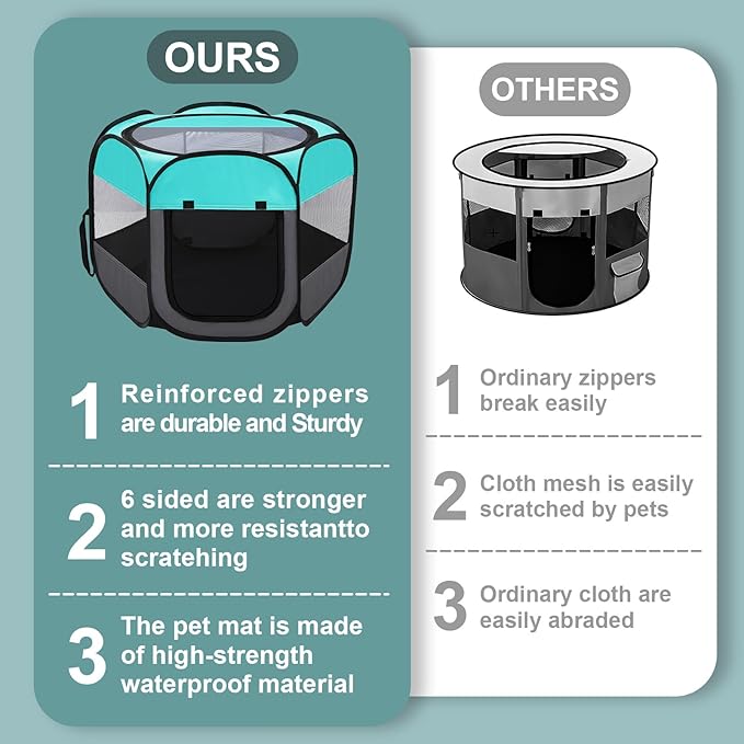 - PET-FRIENDLY DESIGN-The mesh roll-up door of portable dog playpen can be fixed by Velcro, which is convenient for pets to enter and exit without restriction. The semi-mesh design allows the puppy tent to have good ventilation conditions, thus ensuring the comfort of your pet's life. The pet tent is made of 600D Oxford cloth, waterproof and durable.