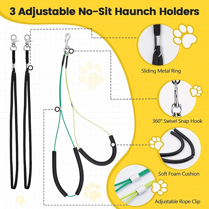 - Innovative Comfort for Medium & Large Breeds: SUNMCCN has upgraded the dog grooming experience for medium and large breeds with 3 no-sit haunch holders. This thoughtful enhancement ensures a more relaxed and stress-free grooming session for both you and your beloved pet. Designed to fit most grooming tables, it offers unmatched versatility and convenience.