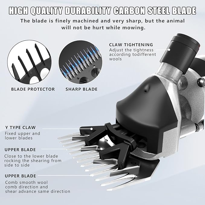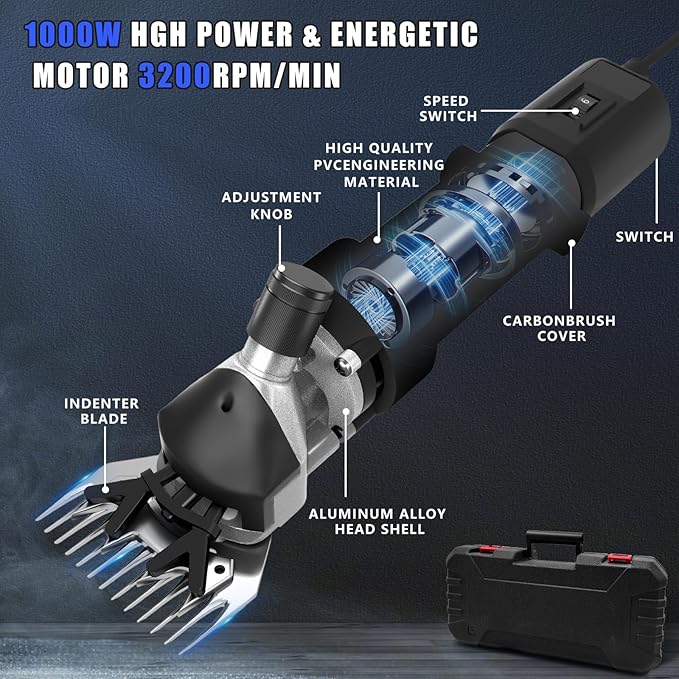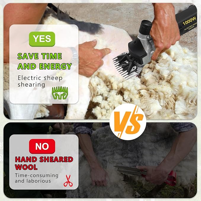 - 1000W Heavy Duty Powerful Motor Shears:Featuring a motor made of heat-resistant copper wire, Sheep Shears 1000W high-power sheep clipper runs at a high speed of 3200 rpm, making wool trimming effortless. Equipped with a cooling mechanism to avoid overheating and extend the machine's life, it can trim 5 to 10 sheep per hour, making it suitable for family farms or ranches