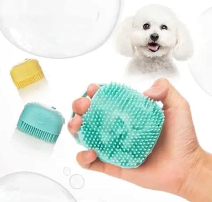 Pet Grooming Bath Massage Brush with Soap and Shampoo Dispenser, Soft Silicone Bristles for Long/Short Hair Dogs & Cats, Shower, Yellow