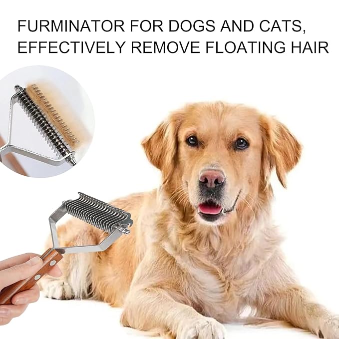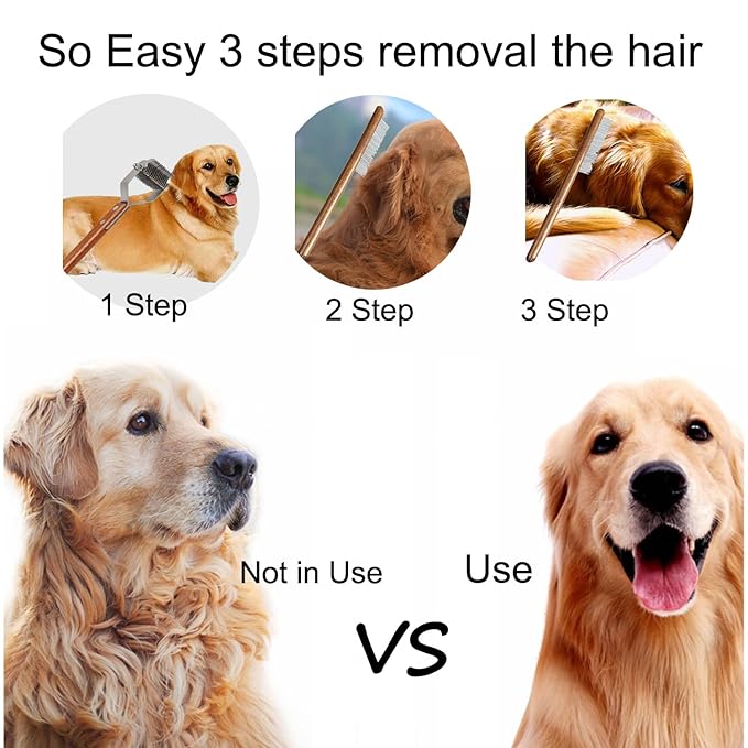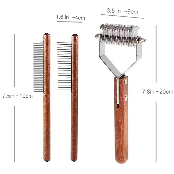 - set with stainless steel + wooden handle structure design, environmentally friendly and does not harm the skin, It contains a double-sided brush with 20 teeth about 8inch, And 2 fluff and dirt cleaning combs, about 7.5in