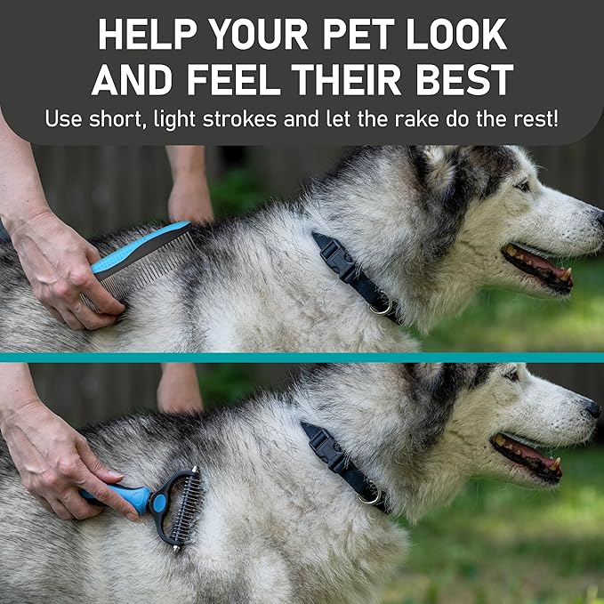 - DUAL-SIDED DESIGN: Our grooming brush is perfect for dematting and deshedding your pet's coat! With a dual-sided design, use the 9-teeth side to tackle stubborn mats and tangles and the 17-teeth side to thin out and deshed your pet's fur.