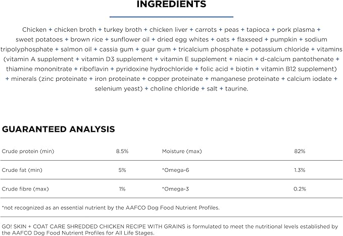 GO! SOLUTIONS Skin + Coat Care Wet Dog Food - Shredded Chicken Recipe with Grains - Complete & Balanced Nutrition for All Life Stages, 12.5 oz (Pack of 4)