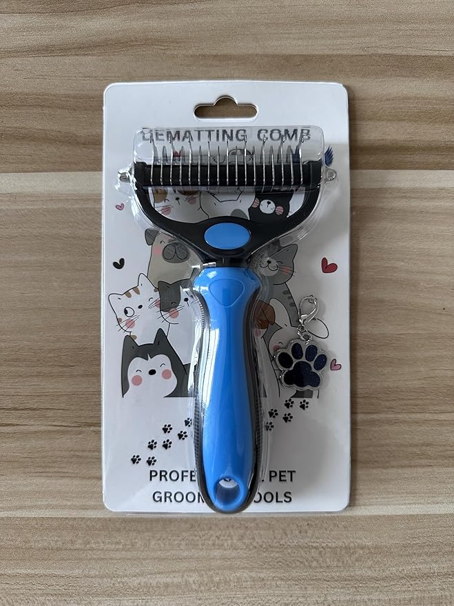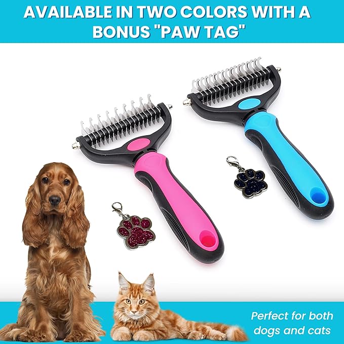 Pet Comb Stainless Steel Double-Sided Shedding Dematting Cat Dog Rake Pet Brush With Stainless Steel Dog Tag,Paw Pet Stainless (BLUE)