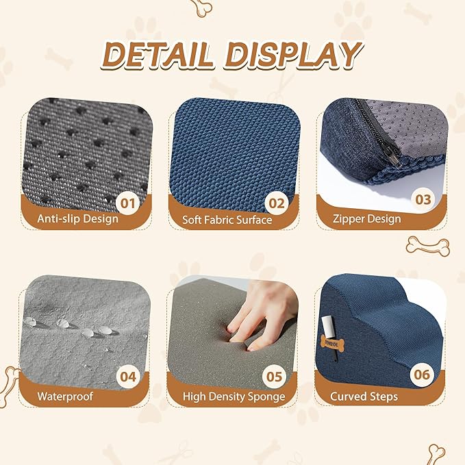 - SAFE AND FIRM: Dog ramp for bed is made of high-density 3D foam. The dense foam has good recovery, can guarantee the best support for dogs and protects the dog's knee joints and provides maximum climbing comfort for puppies and kittens. The foam material is light and easy to carry, and stairs for dogs to get on bed can be used indoors/outdoors. Pet steps for small dogs will not deform even after repeated use
