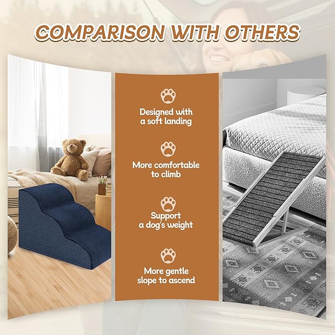 - DOG-FOCUSED DESIGN: Different from traditional right-angle dog stairs, this more scientifically designed slope dog ramp is more suitable for puppies and pets with knee joint injuries. The size of the 3-step pet stairs is 23.6*15.7*15.7 inches, whether it is the bedside, sofa or bay window