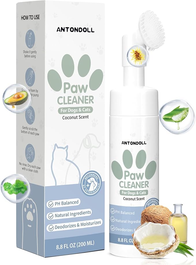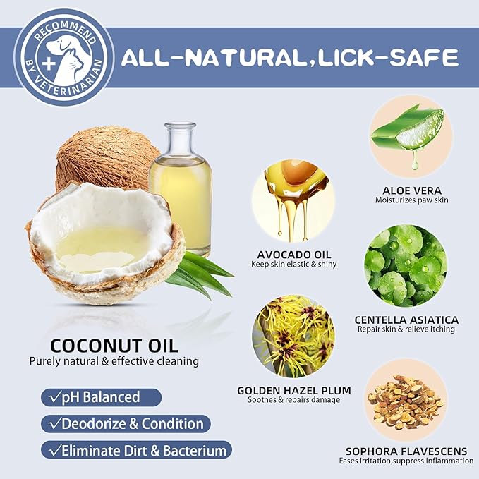 - NATURAL INGREDIENTS: Our dog and cat paw cleaning foam has a plant formula and pH balance, which can effectively clean, moisturize and deodorize paws, especially for dry, cracked or inflamed paws. Coconut Oil helps pads heal and enhances barriers, Aloe Vera soothes itchy and cracked pads, Centella Asiatica repairs skin and relieves itching.