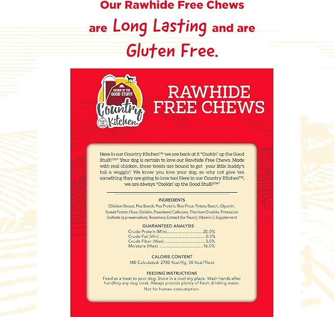 - Country Kitchen Rawhide Free Dog Chews: Our 100% rawhide free chews are made with real chicken as the first ingredient