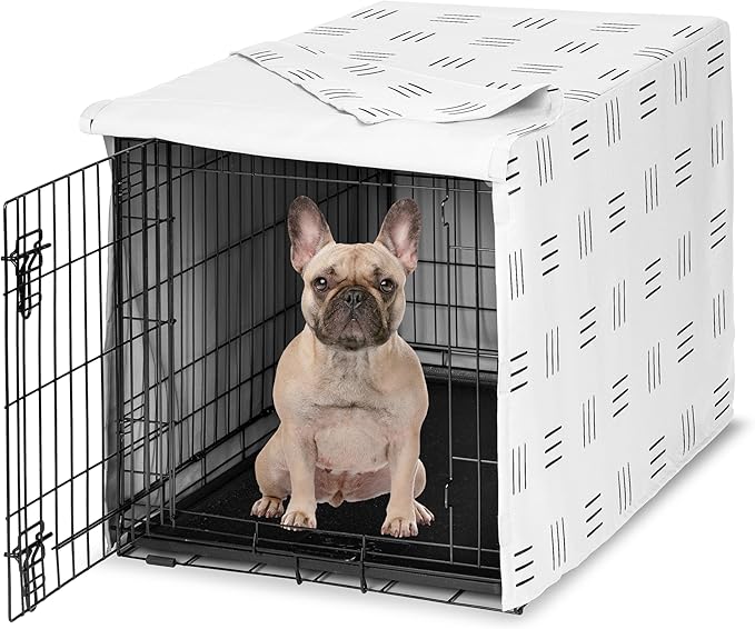 - This durable and stylish dog crate cover is the best way to create a comfortable and cozy space for your four legged friend with a protective canvas fabric that securely covers the top of your pets cage for a dark and tranquil crate at all times. Give your puppy a space where they can rest and relax after a long day of playing or secure flaps with our hook and loop closure design to allow your pet to enter and exit as they please.
