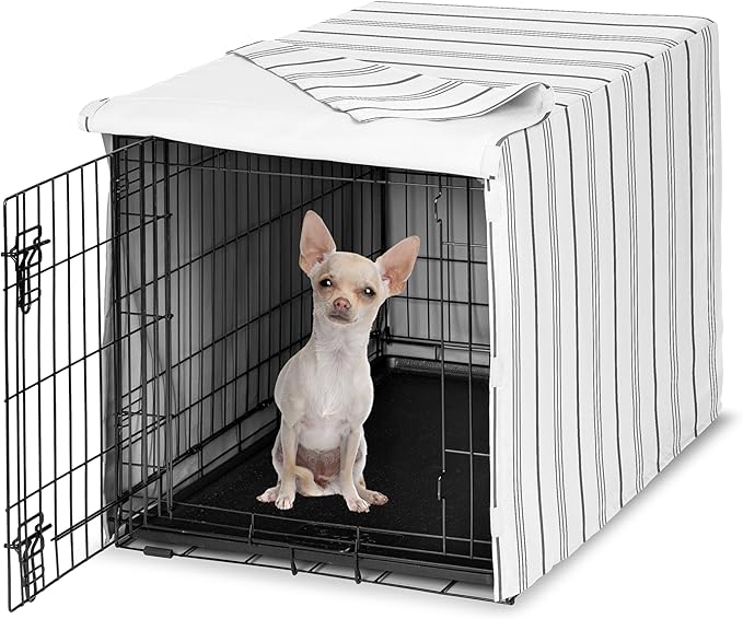 - This durable and stylish dog crate cover is the best way to create a comfortable and cozy space for your four legged friend with a protective canvas fabric that securely covers the top of your pets cage for a dark and tranquil crate at all times. Give your puppy a space where they can rest and relax after a long day of playing or secure flaps with our hook and loop closure design to allow your pet to enter and exit as they please.