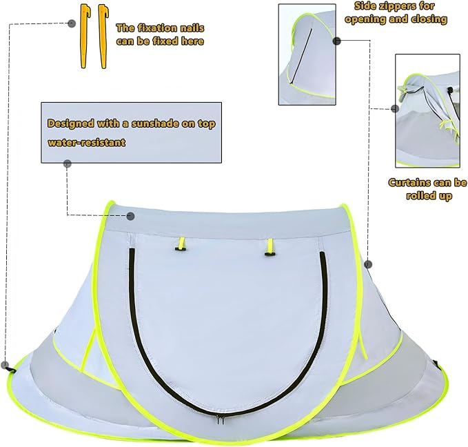 - 【Convenient Use】With convenient snaps, straps, and zippers, it's easy to use. Comes with a storage bag and fixation nails to firmly anchor the tent to the ground or sand.