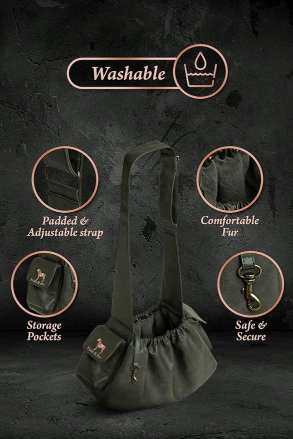 - Luxury dog sling carrier, fashioned from top-tier vegan leather. Designed with your convenience in mind, made with washable materials. This dog sling carrier combines style and practicality, to meet all your expectations.