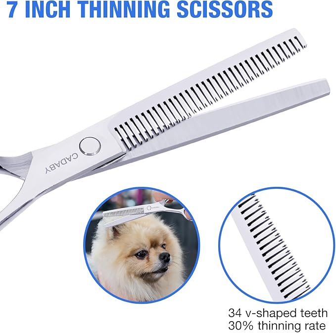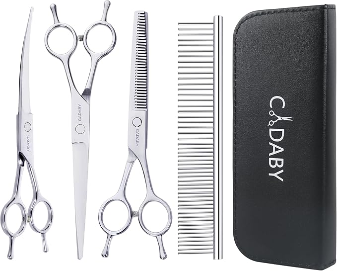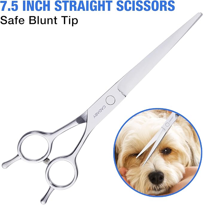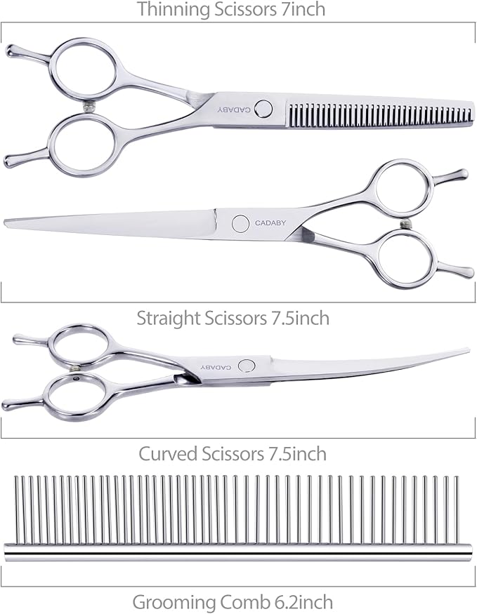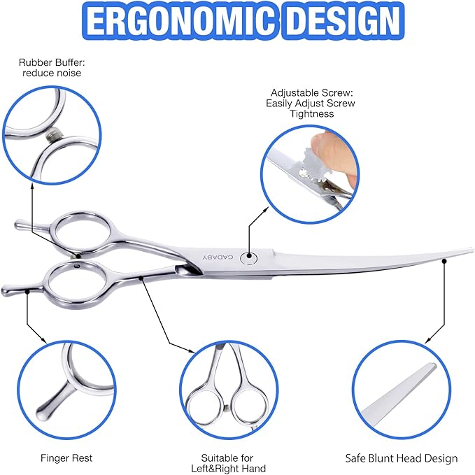 - Ergonomic Design: CADABY dog scissors are comfortable to hold by right or left hand. A rubber bumper at the handle which can reduce noise during trimming and keep your pet won't frightened. Our dog scissors equipped a adjust screw,you can adjust the tightness of the scissors according to your personal feeling. Very convenient