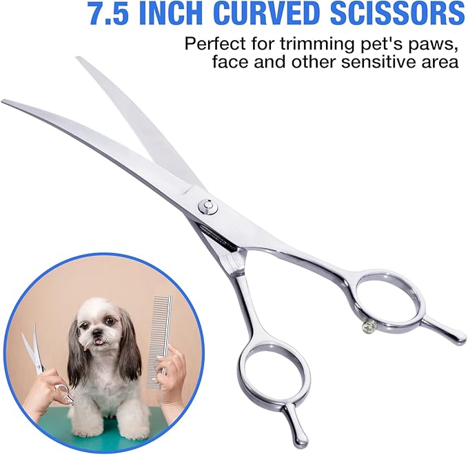 - Professional Pet Grooming Scissors Kit: We use leather waterproof case include 1x 7.5" straight scissors, 1 X 7.5" curved scissors, 1 X 7" thining scissors,1 X pet comb, 1X screw adjuster. you and your pet will get comfortable experience