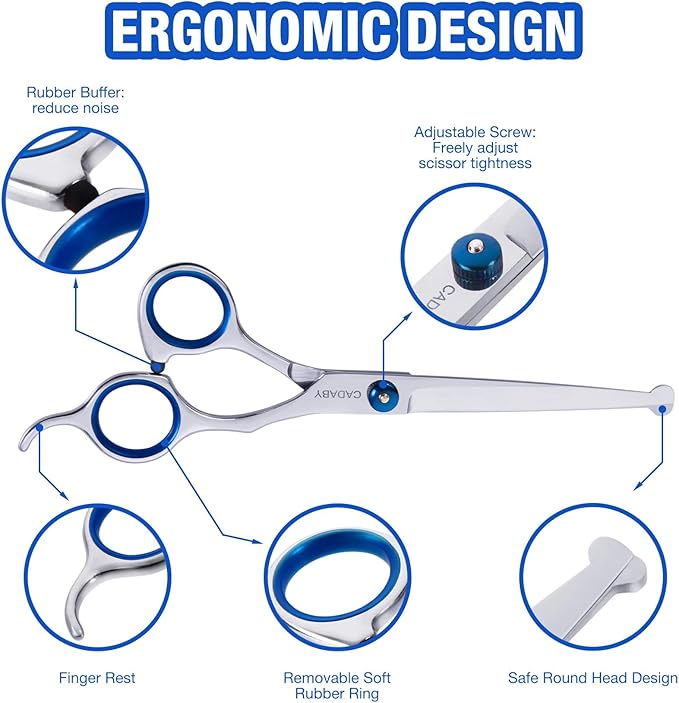 - Ergonomic Design for Use Easily: CADABY dog scissors for grooming are comfortable to hold by right hand. A rubber bumper at the handle which can reduce noise during trimming and keep your pet won't frightened. Our dog scissors equipped a adjust screw,you can adjust the tightness of the scissors according to your personal feeling. Very convenient